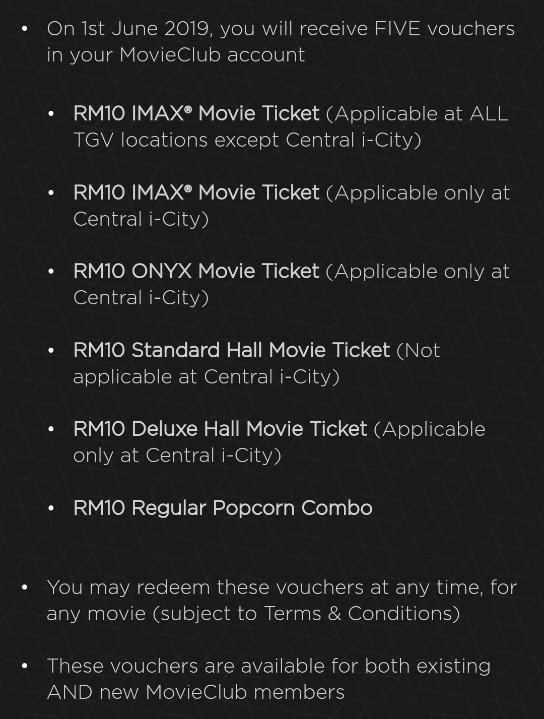 - 在 TGV 电影院的任何消费都可赚取 MovieMoney(MovieClub 积分)。