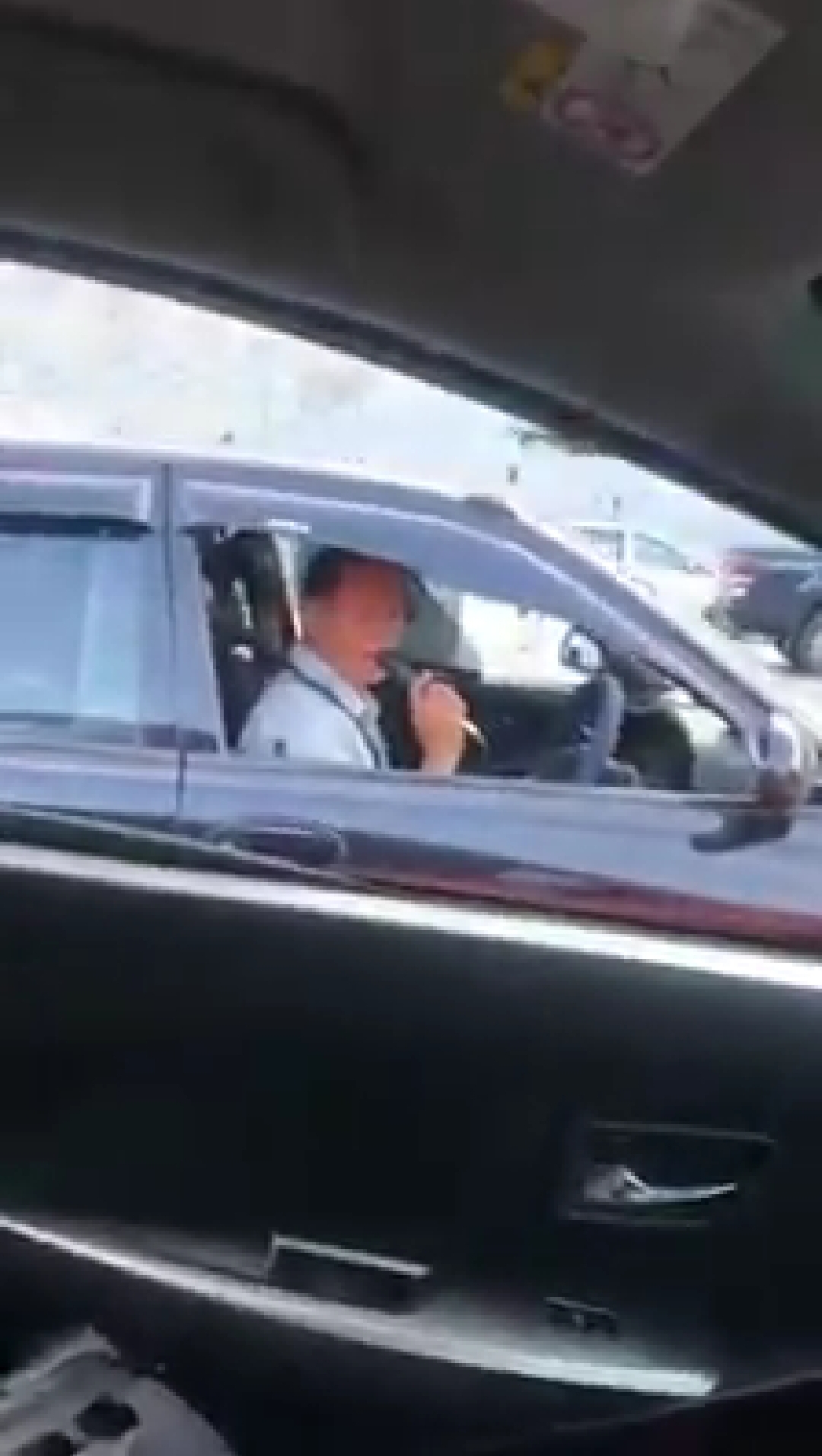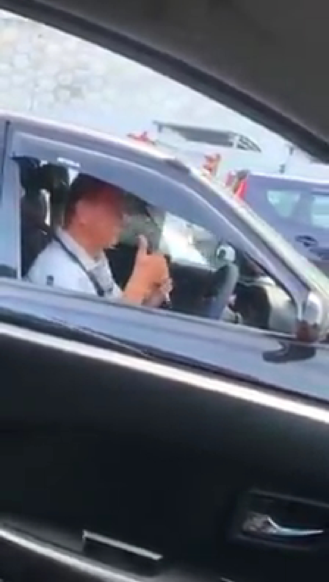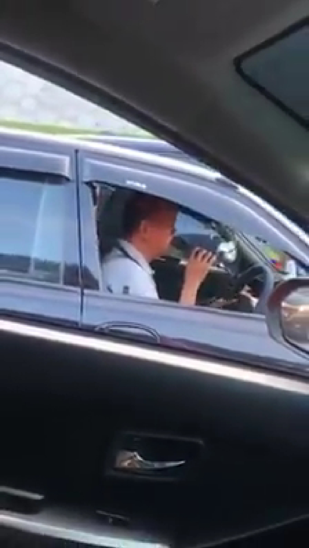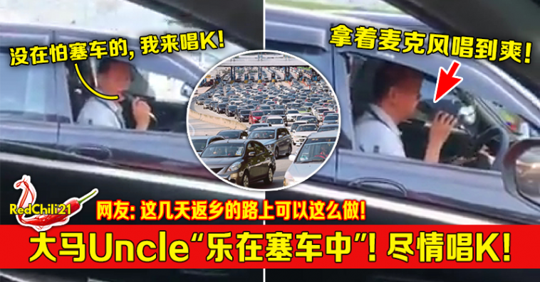该网友在分享帖文的同时也附上了2 个视频,从视频里可以看到,同样被困在车龙里的一位大叔,正在车内自取其乐,拿着麦克风尽情的唱歌!
