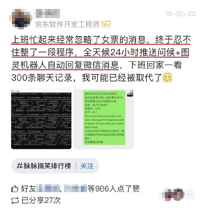 原来这名网友的职业是一名软件开发工程师,由于工作繁忙所以时常忽略了女朋友,求生欲很强的男友为此而设计了一段程序。该程序可厉害了!可以24小时全天候代替男友推送问候给女友,甚至还可以自动回复 Wechat 信息!