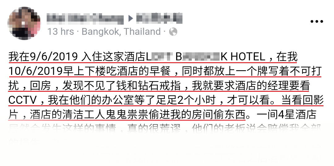 我在9/6/2019 入住这家酒店LXXX BXXXXXK HOTEL,在我10/6/2019早上下楼吃酒店的早餐,同时都放上一个牌写着不可打扰,回房,发现不见了钱和钻石戒指,我就要求酒店的经理要看CCTV,我在他们的办公室等了足足2个小时,才可以看。当看回影片,酒店的清洁工人鬼鬼祟祟偷进我的房间偷东西。一间4星酒店居然会发生这样的事情,真的很荒谬,他们的老板说会赔偿我全部的损失,就算找不到我的财物和戒指,老板都说会付全部责任,包括会和AGODA说退回钱给我们。