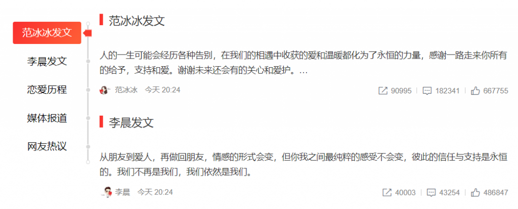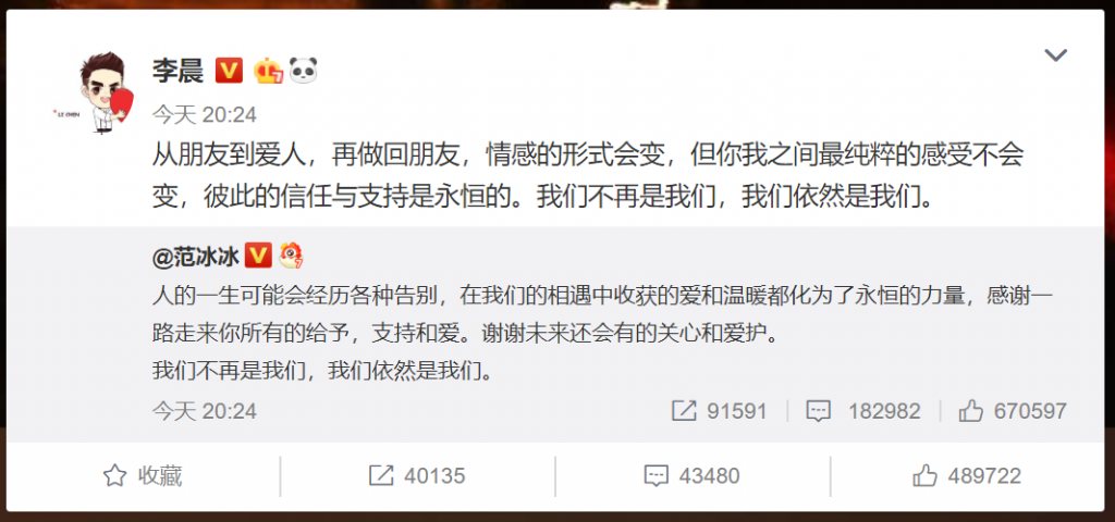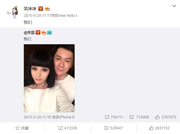 ▼范冰冰抢先一步先在微博发文,然后李晨也回应了!