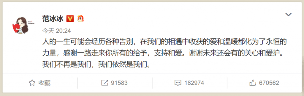 ▼范冰冰: 「人的一生可能会经历各种告别,在我们的相遇中收获的爱和温暖都化为了永恒的力量,感谢一路走来你所有的给予,支持和爱。谢谢未来还会有的关心和爱护。」