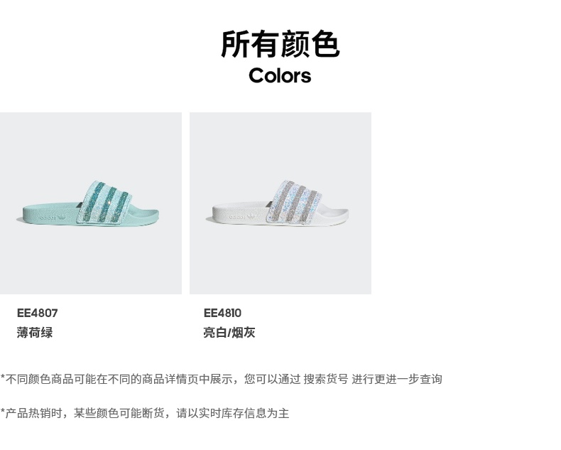 这款拖鞋高调的同时也保持着低调,远看时所看到的是闪闪发亮的浅蓝亮片,近看又能看到与拖鞋融为一体的“Adidas”字样!穿上它出街回头率绝对是百分之百!