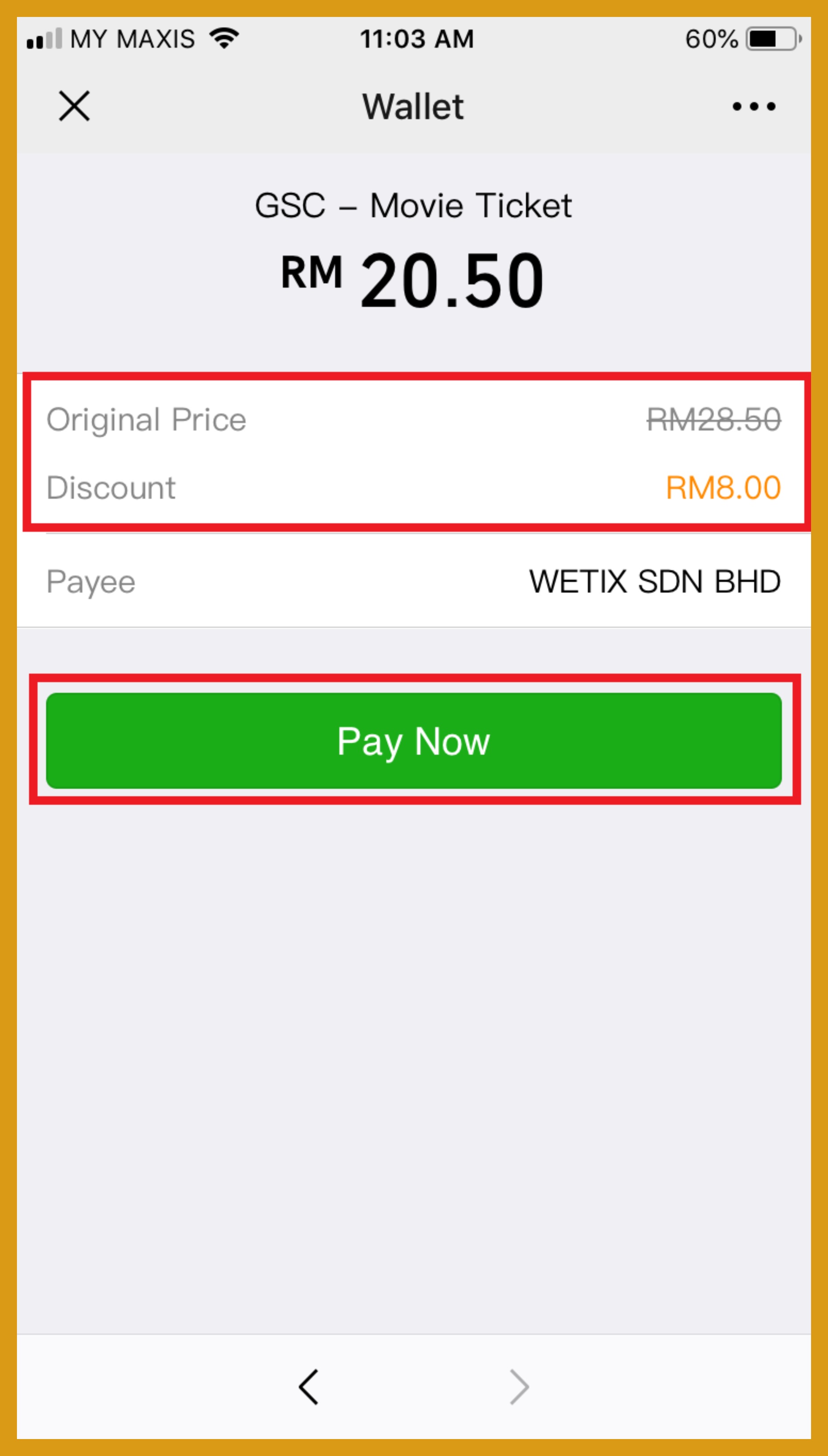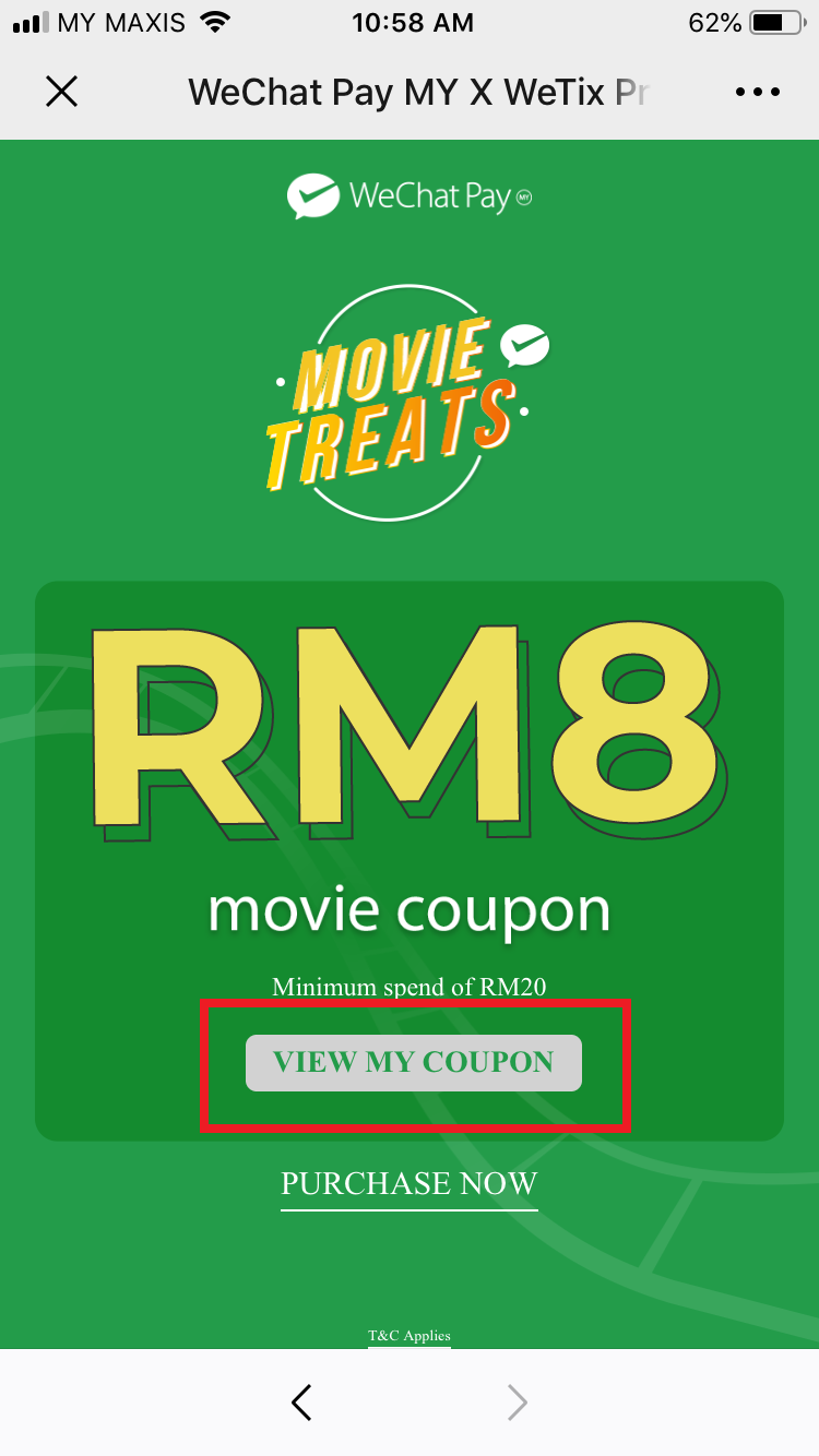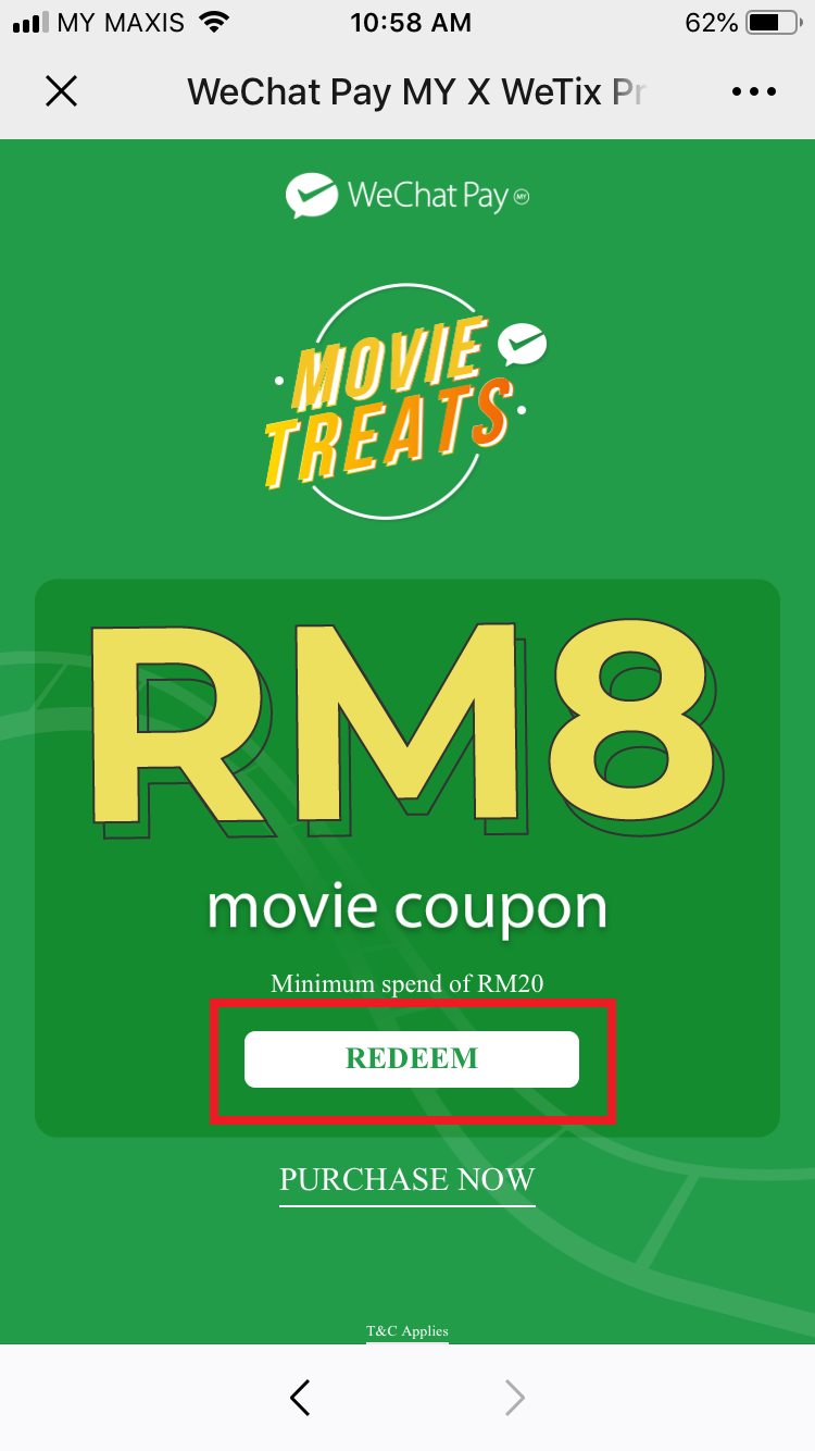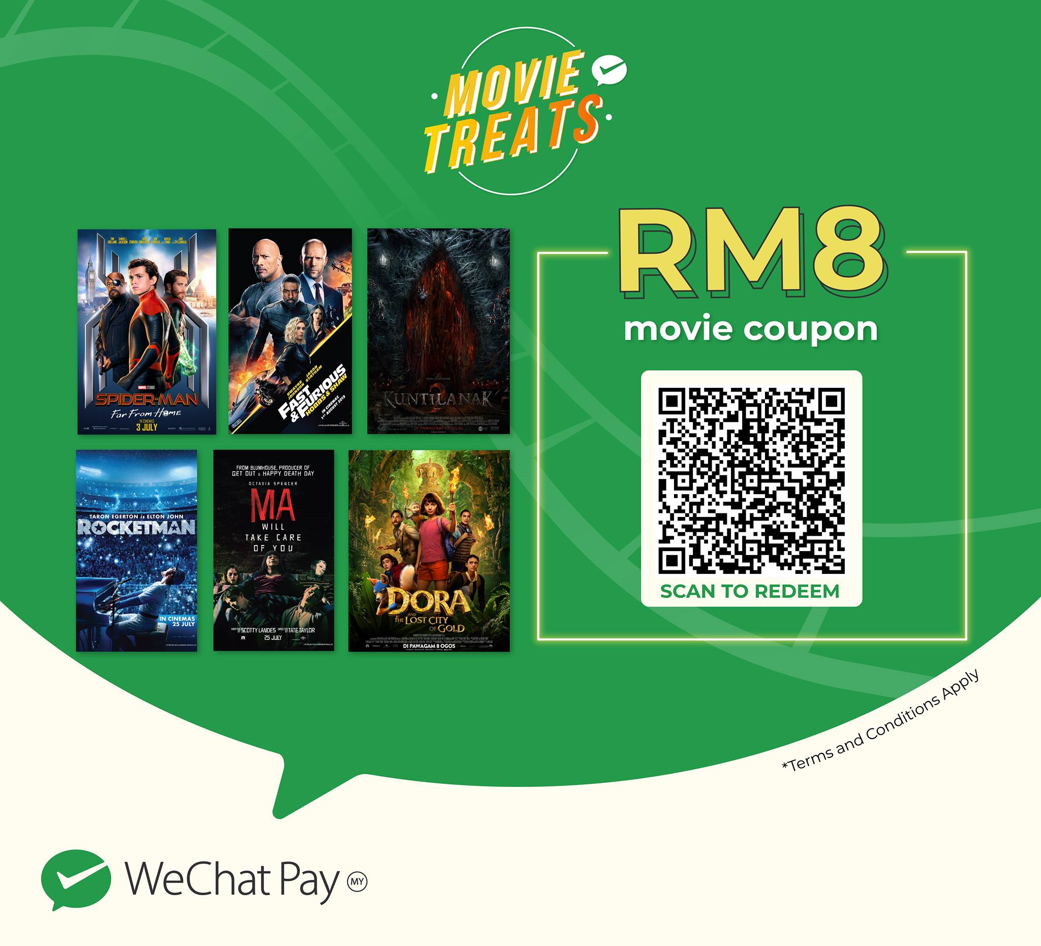 现在只要你通过 WeChat Pay电子钱包订购电影票,立即获得RM8折扣优惠!