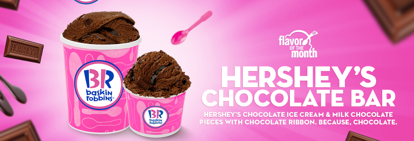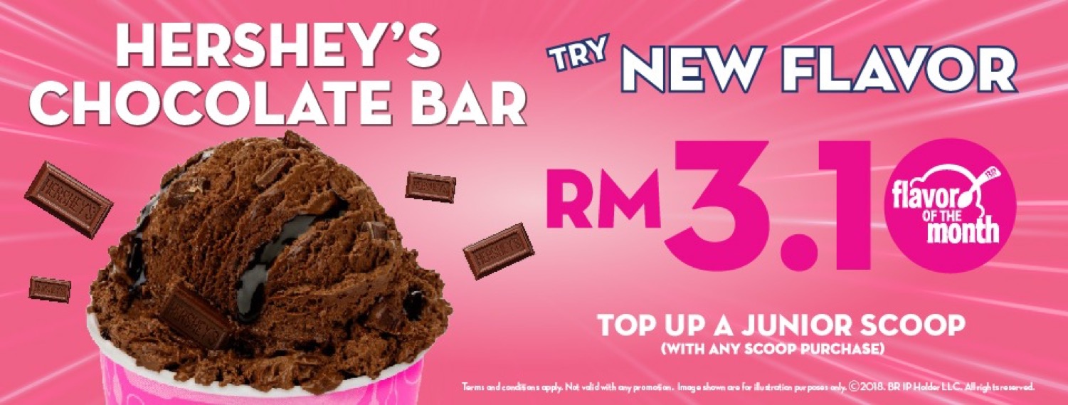 只要购买任何1scoop的Baskin Robbins,只需RM 3.10就可以top up一个新口味Hershey’s Cocolate Bar冰淇淋啦!