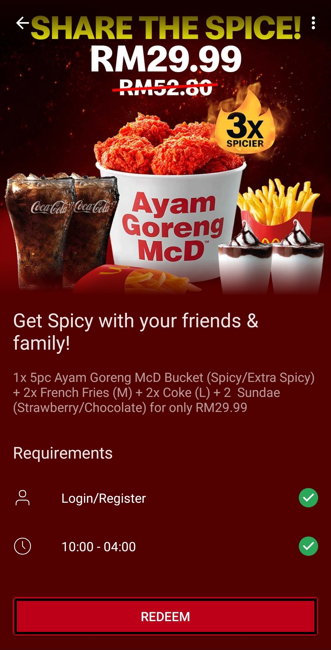 ▼ EXTRA SPICY Ayam Goreng McD 和 Ayam Goreng McD 套餐,现在只需RM29.99(原价 RM52.80)!