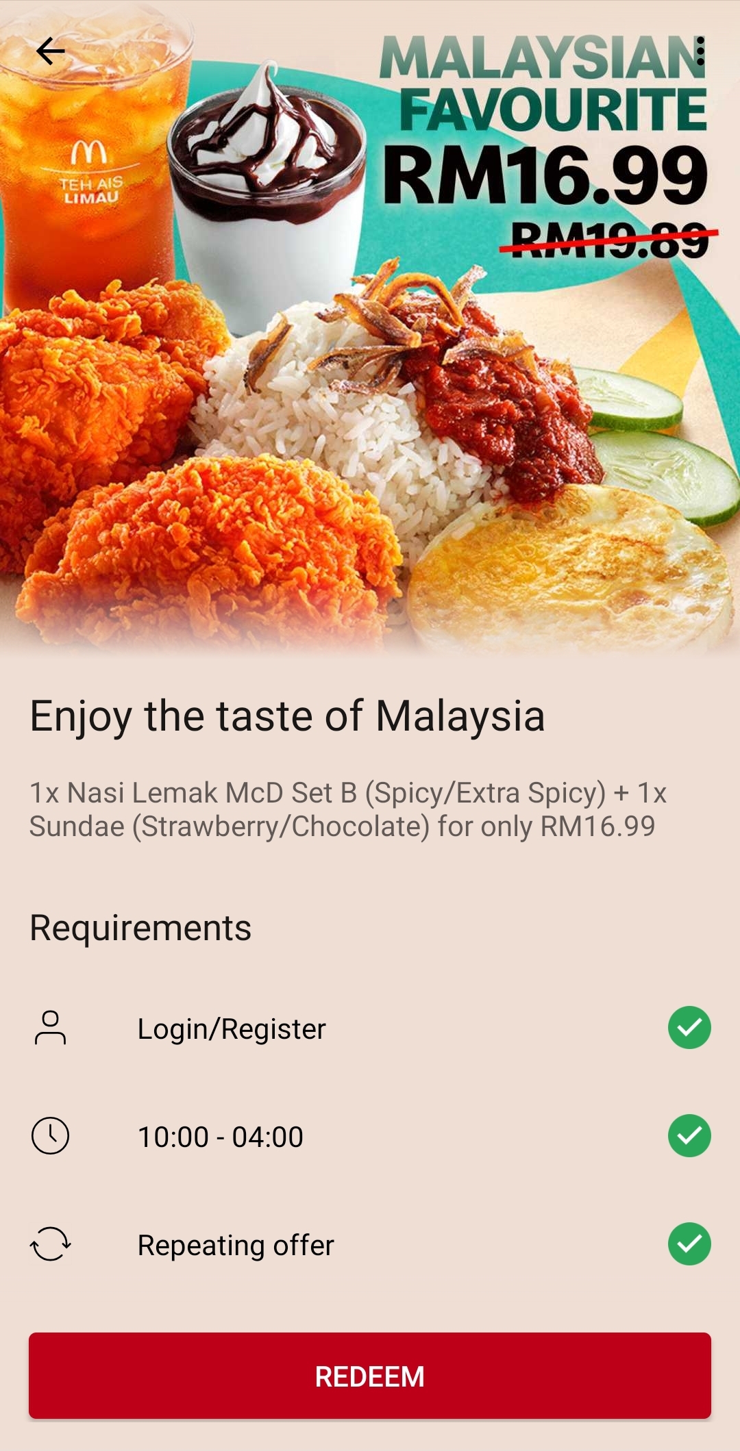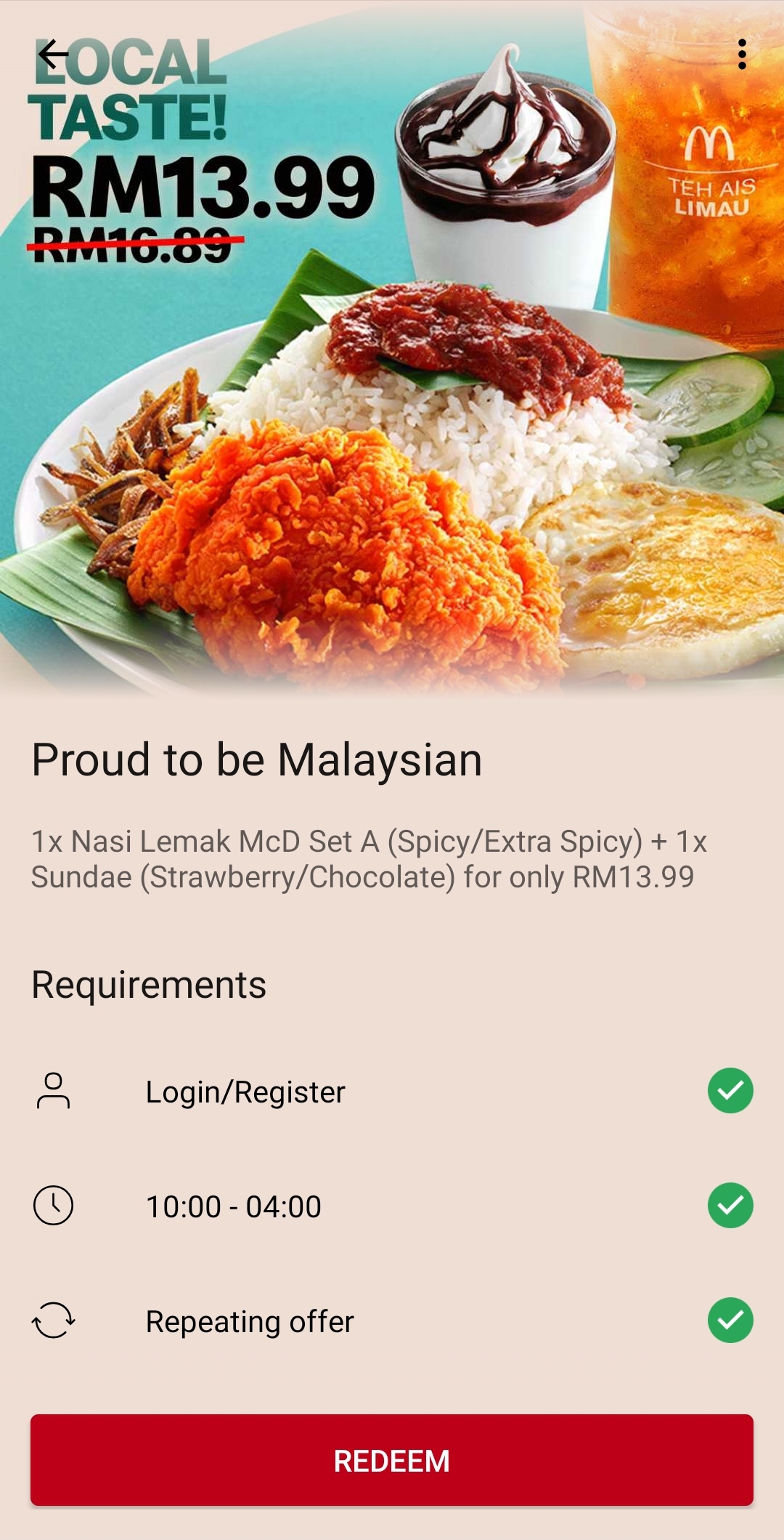 ▼ NASI LEMAK McD Set A 现在只需RM13.99(原价 RM16.89)!