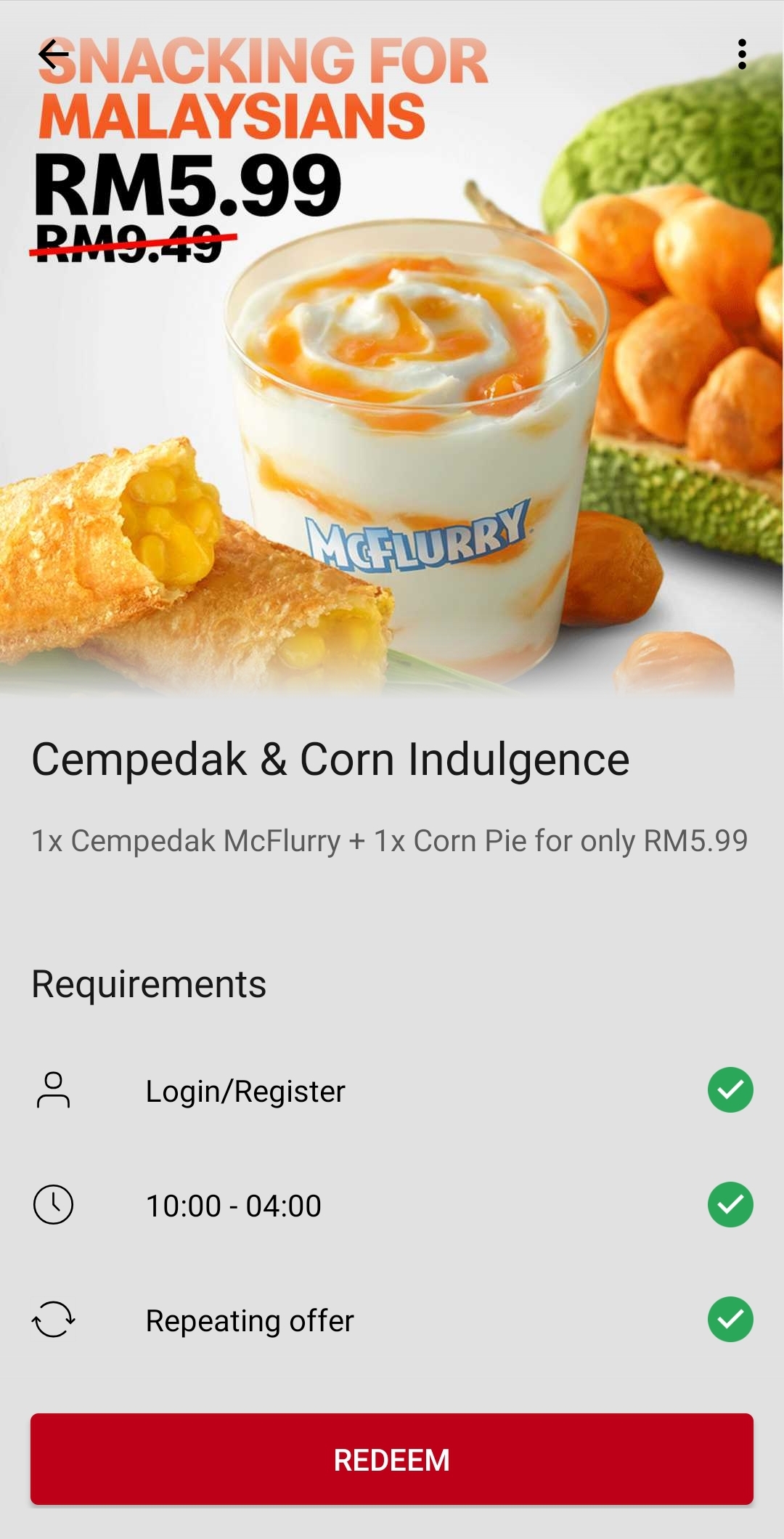 ▼ Corn Pie 和 Cempedak McFlurry 组合,现在只需RM5.99(原价 RM9.49)!