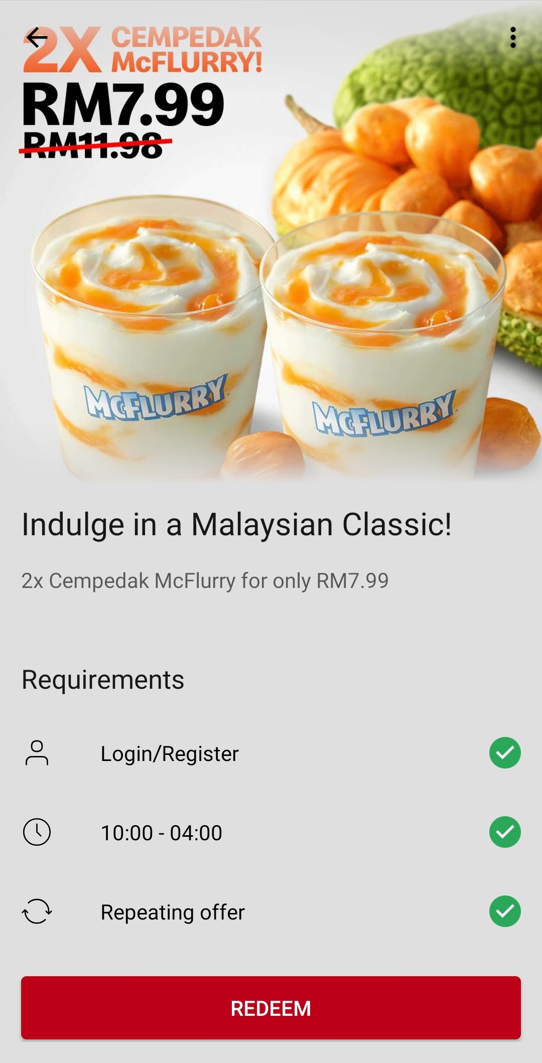 ▼ 2 杯 CEMPEDAK McFLURRY 现在只需RM7.99(原价 RM11.98)!