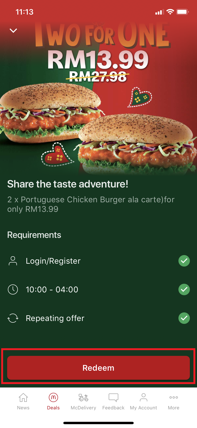 这项优惠只需付一份汉堡包的钱就可以获得两个Portuguese Chicken Burger 汉堡包!简称Buy 1 Free 1!