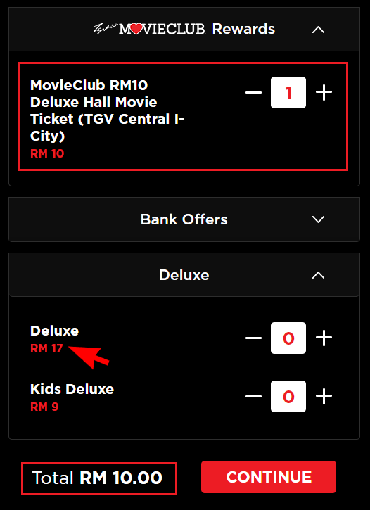※只需RM10就能买到RM17的Deluxe电影票,相等于获得41.2%的折扣!