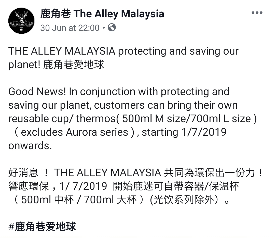 而鹿角巷(The Alley)也听见广大网友们的心声啦!就在昨天晚上,鹿角巷的官方面子书就PO文宣布,即日起可以自带容器或保温杯去鹿角巷购买饮料了!