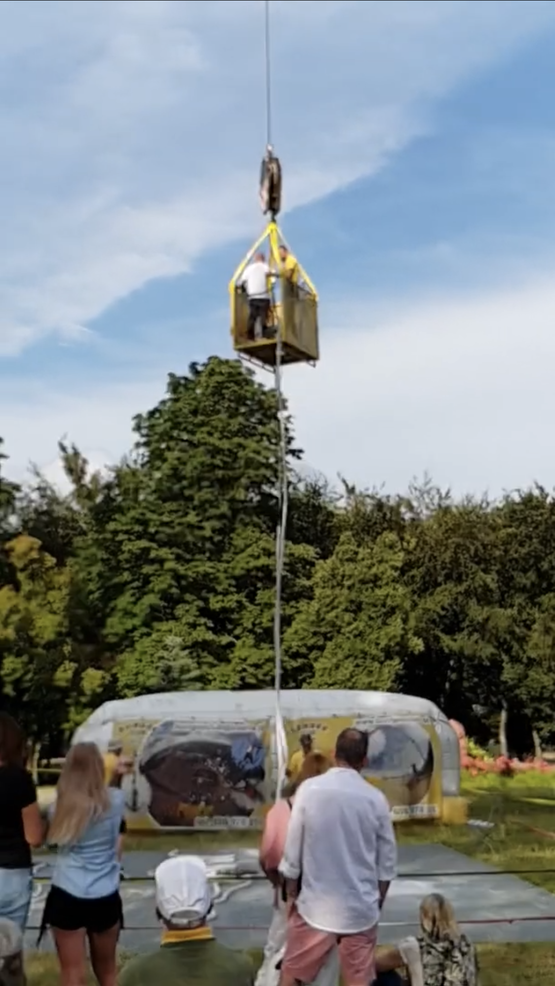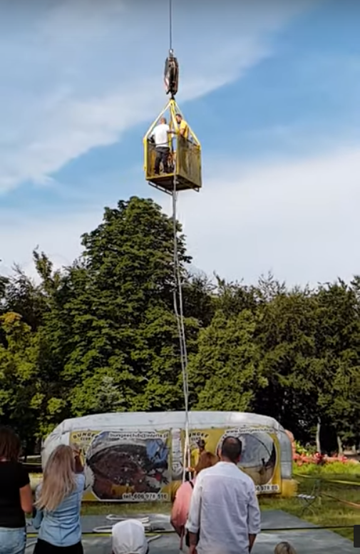 起先,该名男子是由一个起重机让他升到一定的高度。