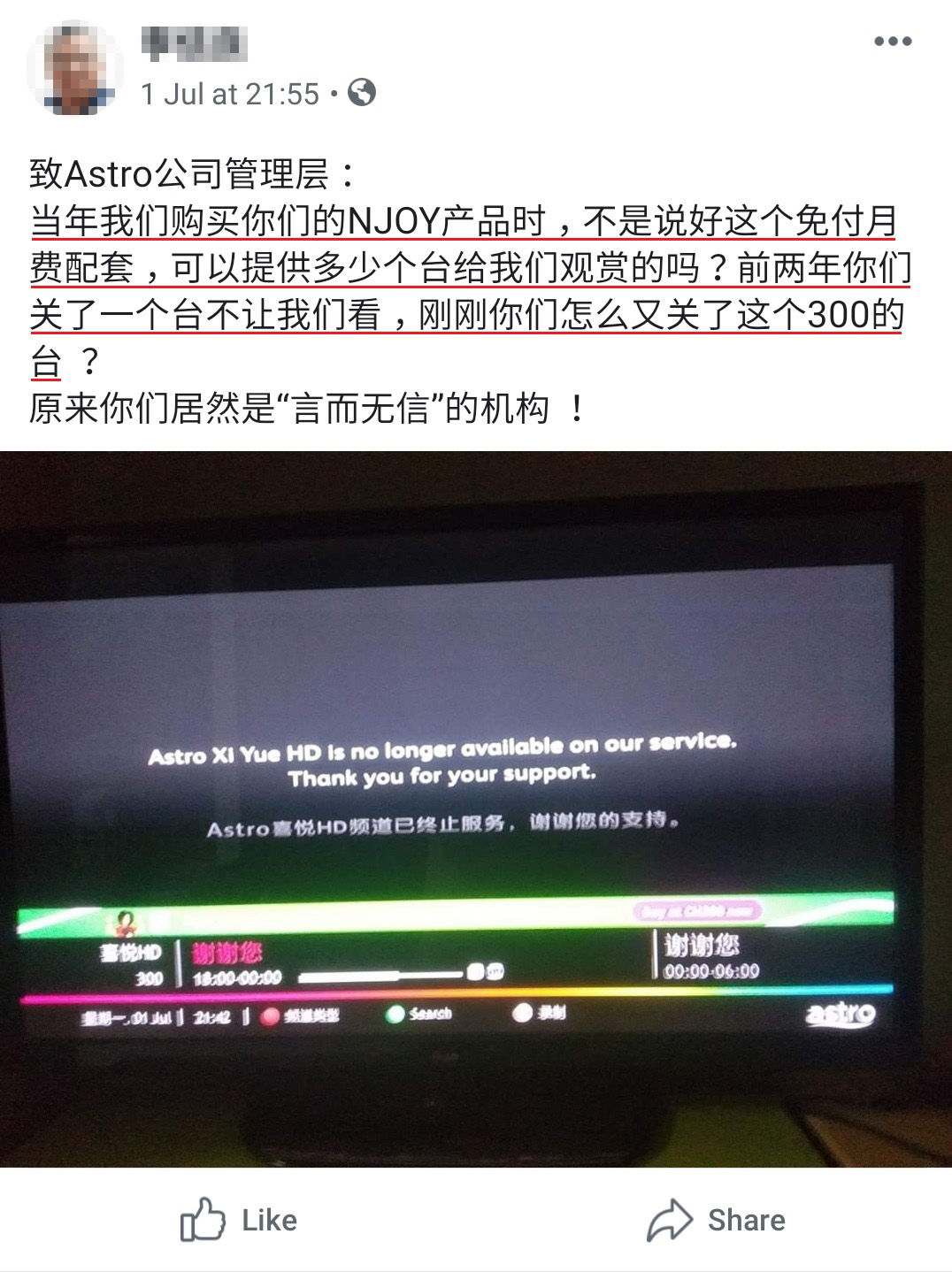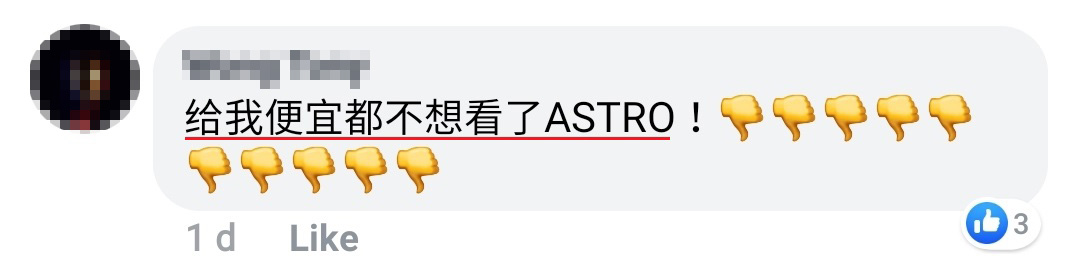 该网友在帖文里宣泄他对 Astro 的极其不满,因为 Astro 的配套价格一直在调涨,服务没有改善,反而接二连三地停播一个台又一个台!
