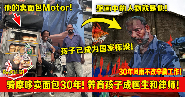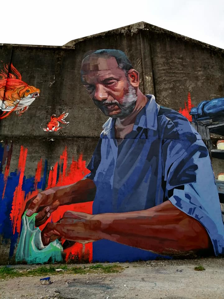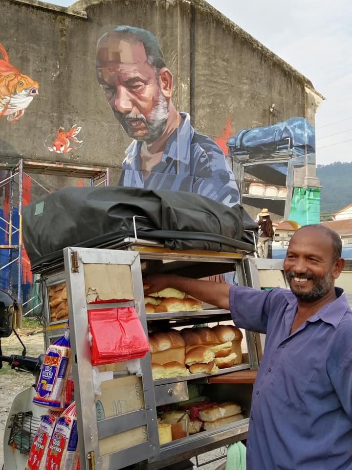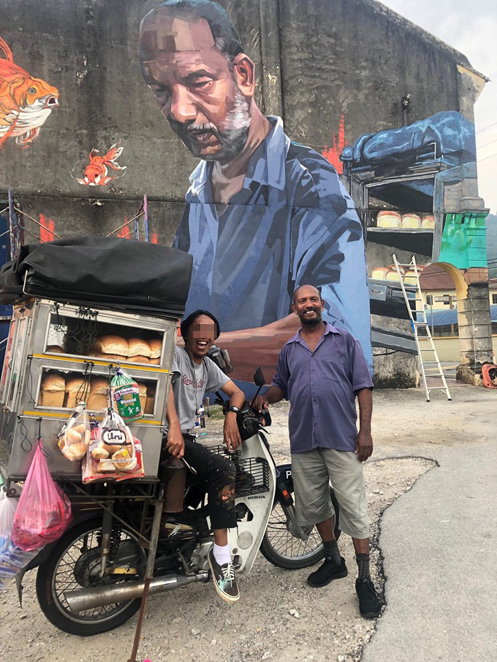 本地有一名壁画艺术家在浮罗山背(Balik Pulau)的其中一道墙上绘画了一副面包叔叔的壁画,画中的叔叔就是那个30年来不辞劳苦架着motor卖面包的叔叔!