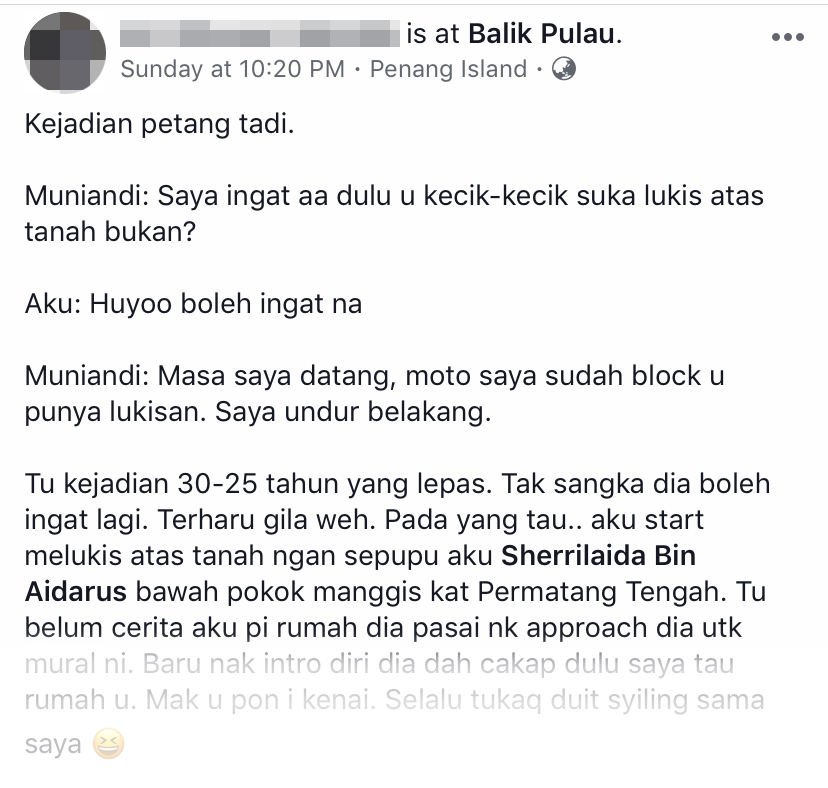 作者在帖文中感谢国家艺术中心及旅游、艺术与文化部副部长巴迪亚给予的信任及支持,让本地艺术家能完成这项浮罗山背壁画能够顺利完成。