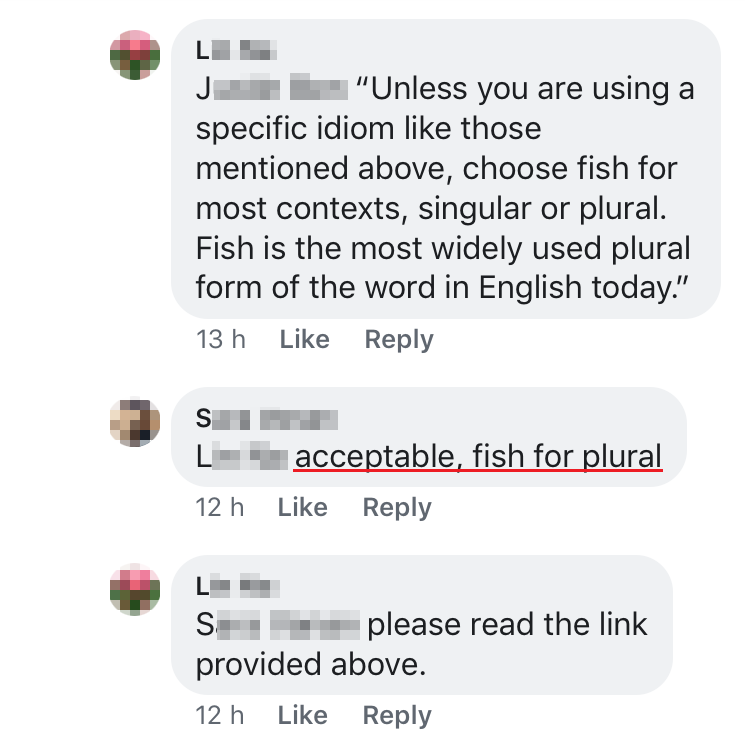 ▼当大家还在争议着是否是好的方案,这里出现了“英语狂人”纠正了帖主应该用“fish”而不是“fishes”。