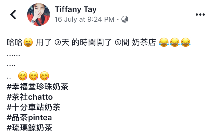 Tiffany也在帖子表示这些设计花了她3天的时间才成功“开了”5间奶茶店!