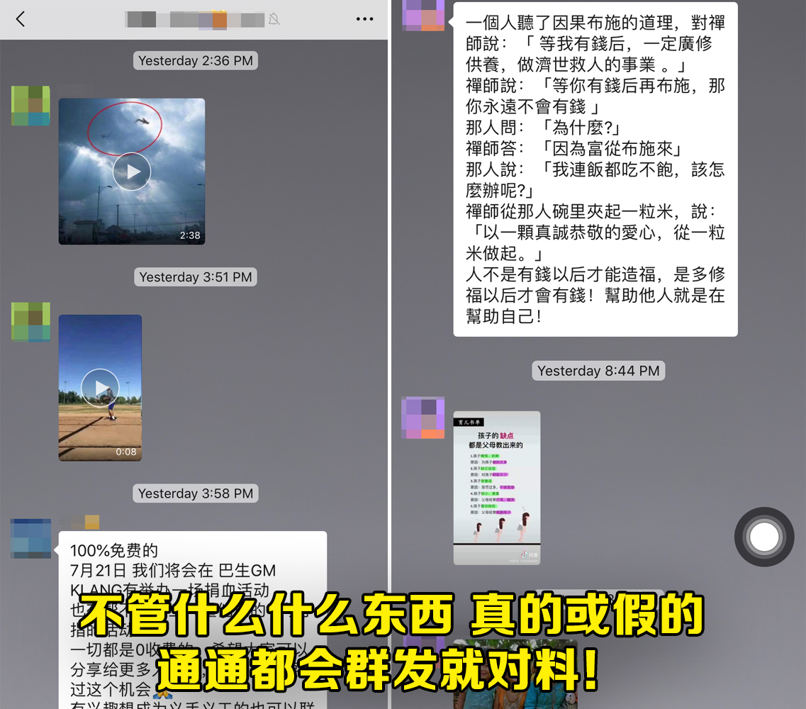 常常会发现亲戚家人或有很多aunty uncle的群里都会有很多这样的信息,比如印尼火山地震啊、subang车祸啦、cheras有警察blocking啦、天空出现龙UFO、哪里有迷魂党等等什么信息都发!很多时候,那些资讯已经过时很久料咯!他们都不管对不对的,通通都会发出去就对了!