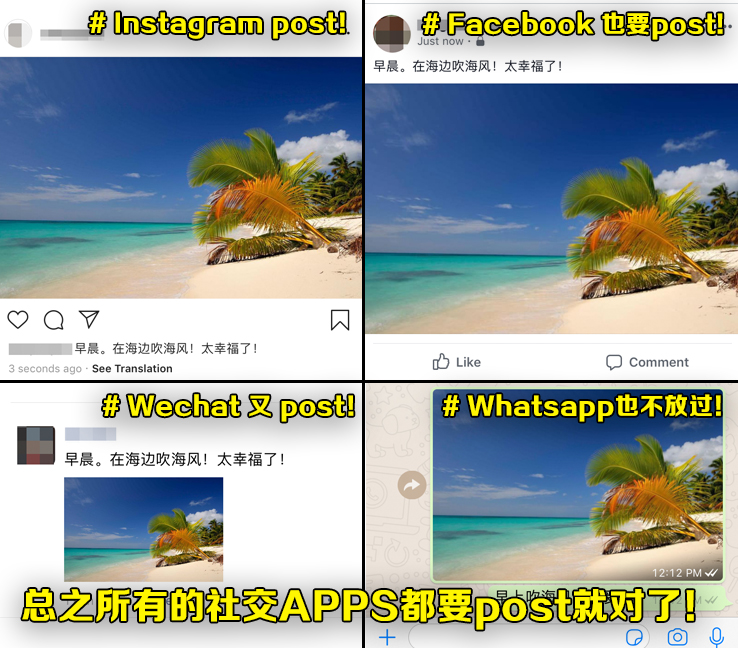 小编还发现到就是,aunty uncle 要post状态或照片时,只要他们有用的社交apps他们都会post到完!所以上fb的时候看到那个照片、开instagram时又在看到、开微信朋友圈时又看到!他们真的是太可爱了~
