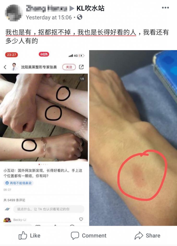而近日大马有一名网友就在面子书分享一则网络资讯,说道:长得好看的人,手臂中间都有有痣!