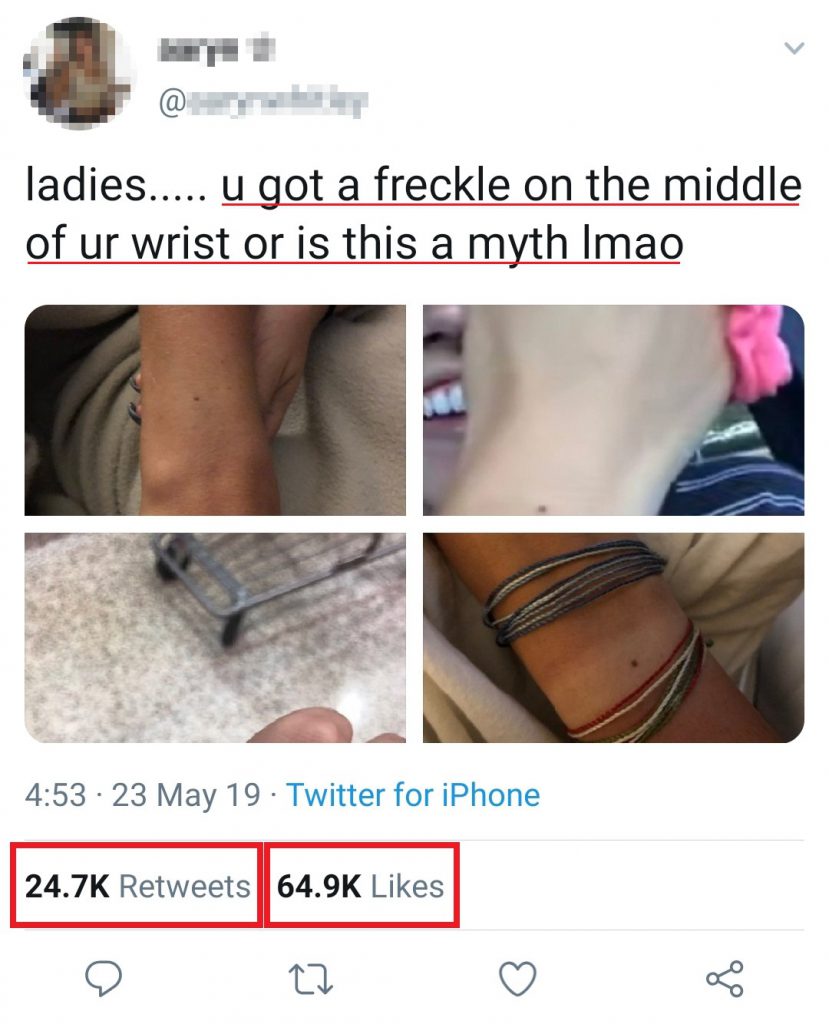 该网友所分享的截图内容写着:「国外网友新发现,长得好看的人,手上这个位置都有一颗痣。」