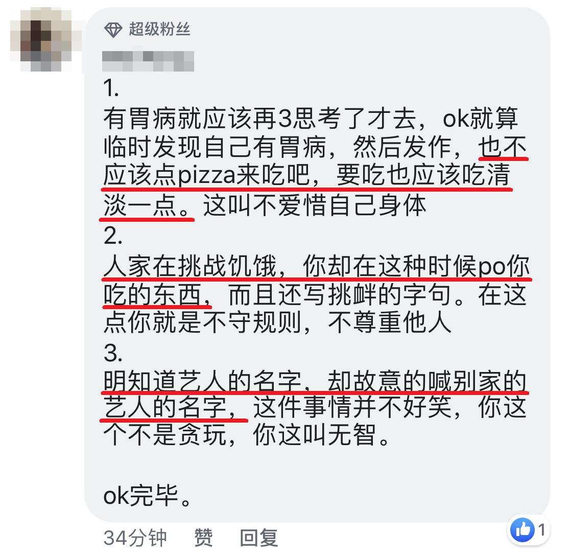▼网友表示胃病也不应该吃Pizza,应该吃清淡的食物。而且明知道艺人的名字还故意喊别人的名字