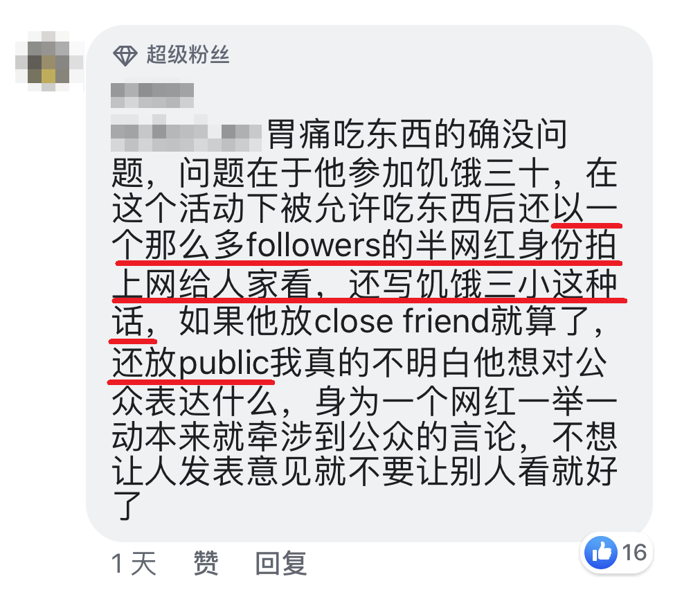 可以看得出,该名网红不仅没有禁食,而且还在社交平台上发布了食物的照片,配文上还大胆写着:“饥饿3小”!不仅如此,他还对着“饥饿30”爱心大使“尤长靖”大喊“吴亦凡”!