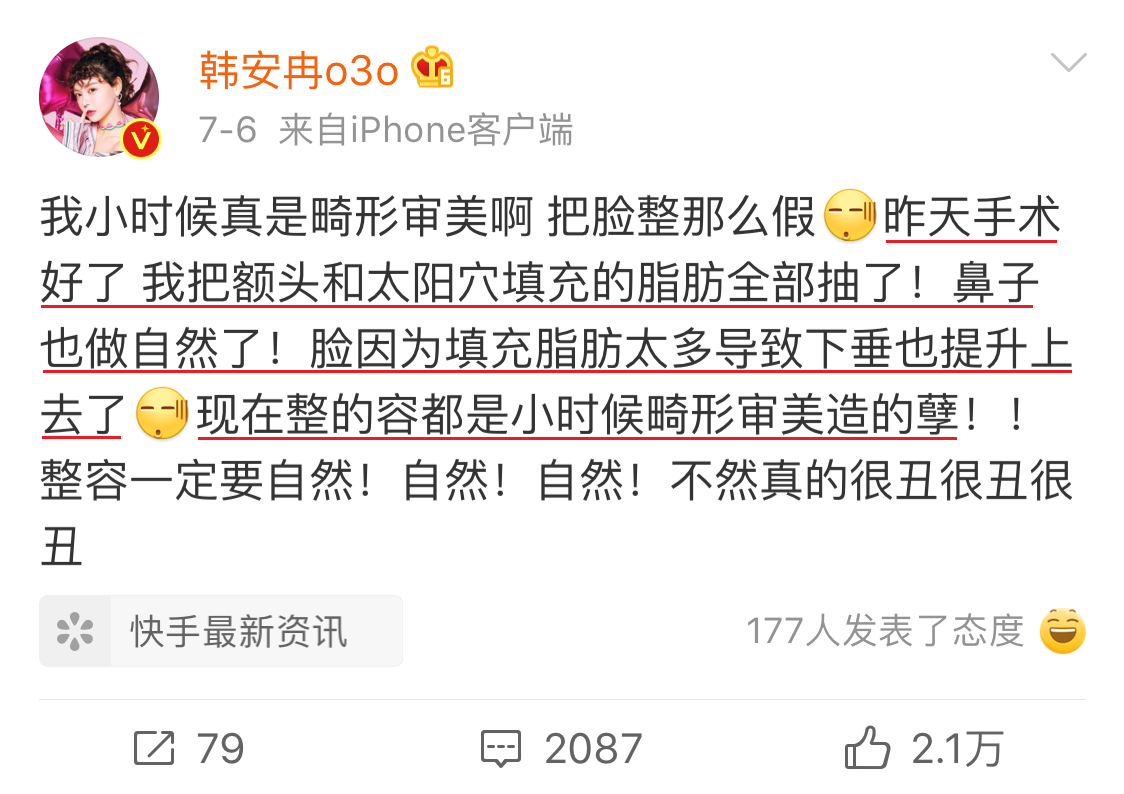 该帖文的内容说道,韩安冉突然意识到现在的脸已经整得太假了,这样的她并不好看,因此她决定再去动一次手术!把额头和太阳穴补充的脂肪全部抽出来,笔挺的鼻子也重新还原。原本因为补充太多脂肪而导致下垂的脸,现在也通过手术提升上去了!