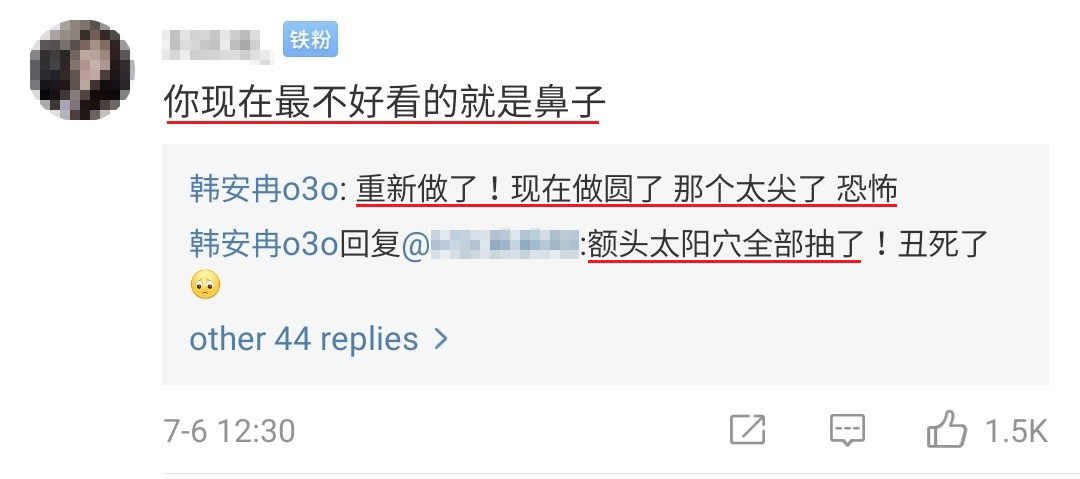▼ 还有网友直言:「你现在最不好看的就是鼻子!」韩安冉这样回应!
