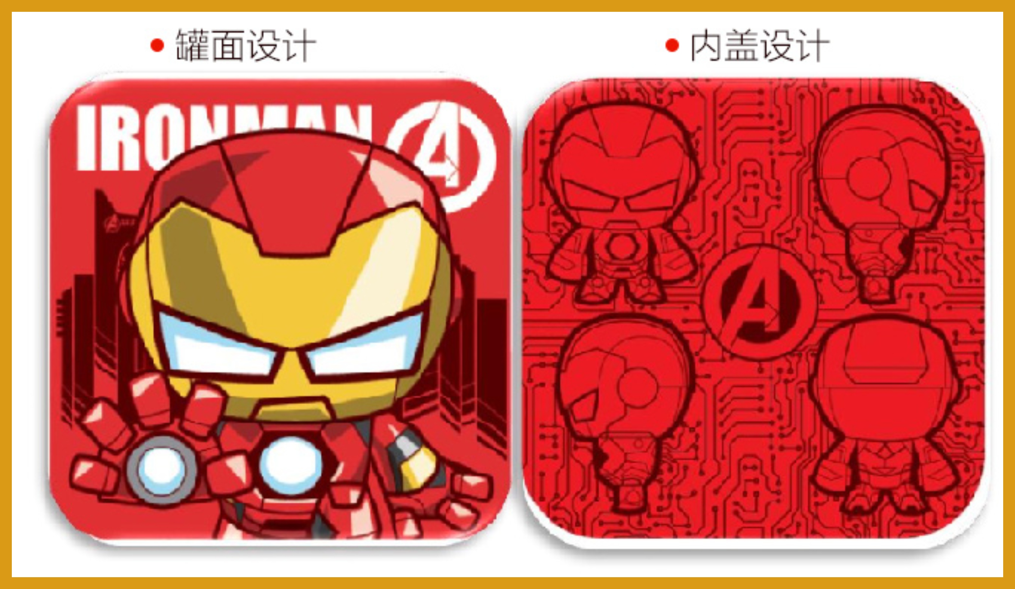 而礼盒盖子上分别都有罐面3D造型的超级英雄和钢铁侠!