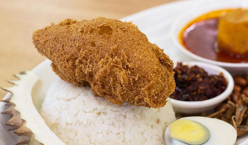 椰浆饭+炸榴莲!椰浆饭本身已经是我们大马人吃到不要吃的“麻麻档”料理啦!但是炸榴莲你吃过吗?外面咬下去就有满满的酥脆感,里面就是“榴莲迷”所喜爱的榴莲味!配上椰浆饭和咖喱马铃薯,搭配吃就非常解腻!