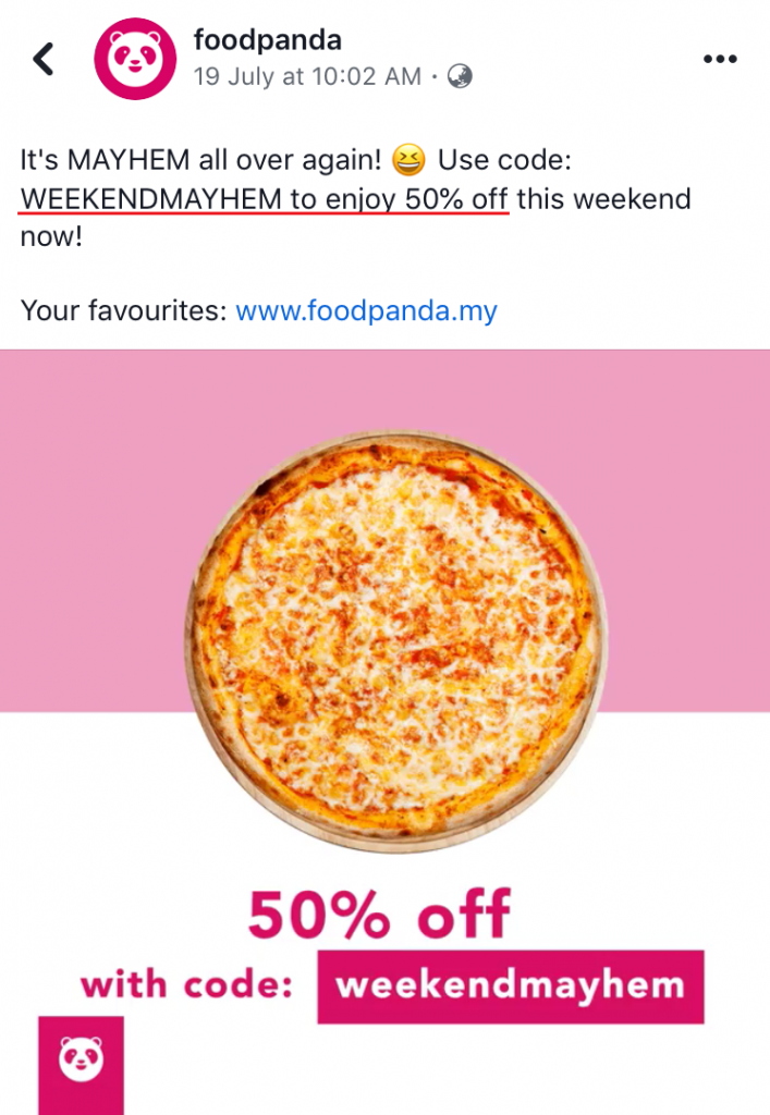 1)Foodpanda50%折扣优惠 – 优惠码:weekendmayhem