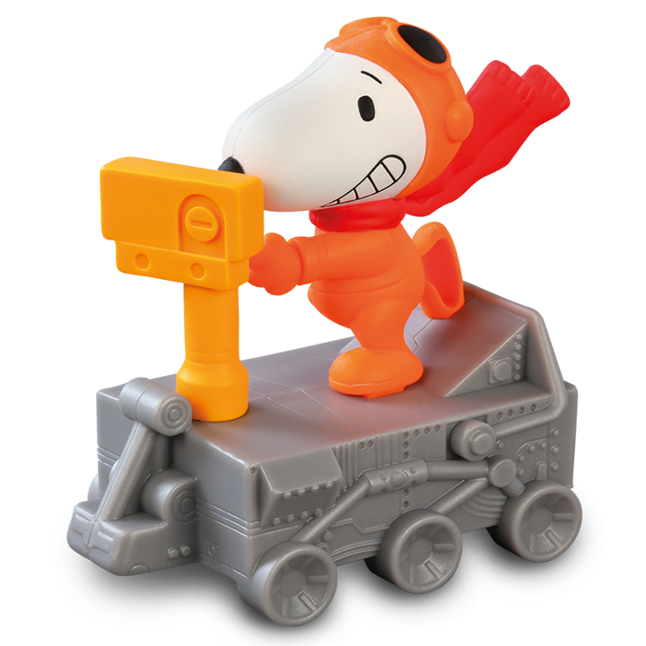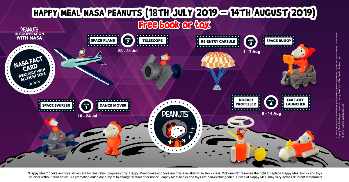 McDonald’s在接下来的4个星期内,将分别送出8种款式的 【Happy Meal Nasa Peanuts】玩具 。注意咯!是每1星期送出2款玩具哦!
