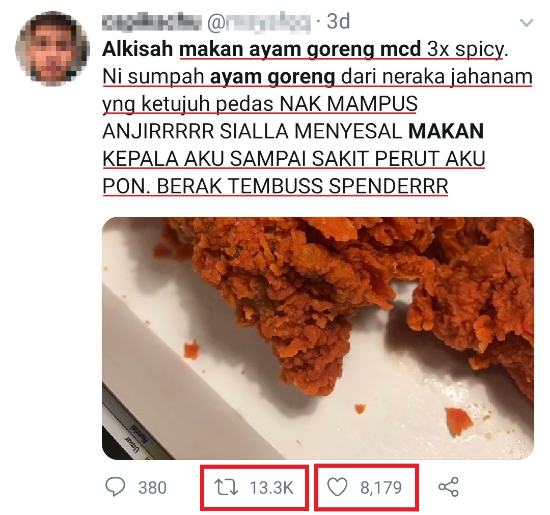 帖文里写道:「话说,我吃了麦当劳3倍辣炸鸡的故事。我发誓它的辣度是来自地狱第7层的辣,真的是辣“死”我了!我吃了以后马上就后悔了,肚子痛、拉肚子拉到连内裤都破了个洞!」