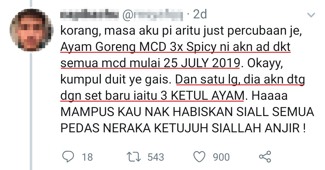 大马 McDonald’s 静悄悄地在指定分行推出了3倍辣的炸鸡(Ayam Goreng McD),已经尝试过的网友们都表示:真的很辣!