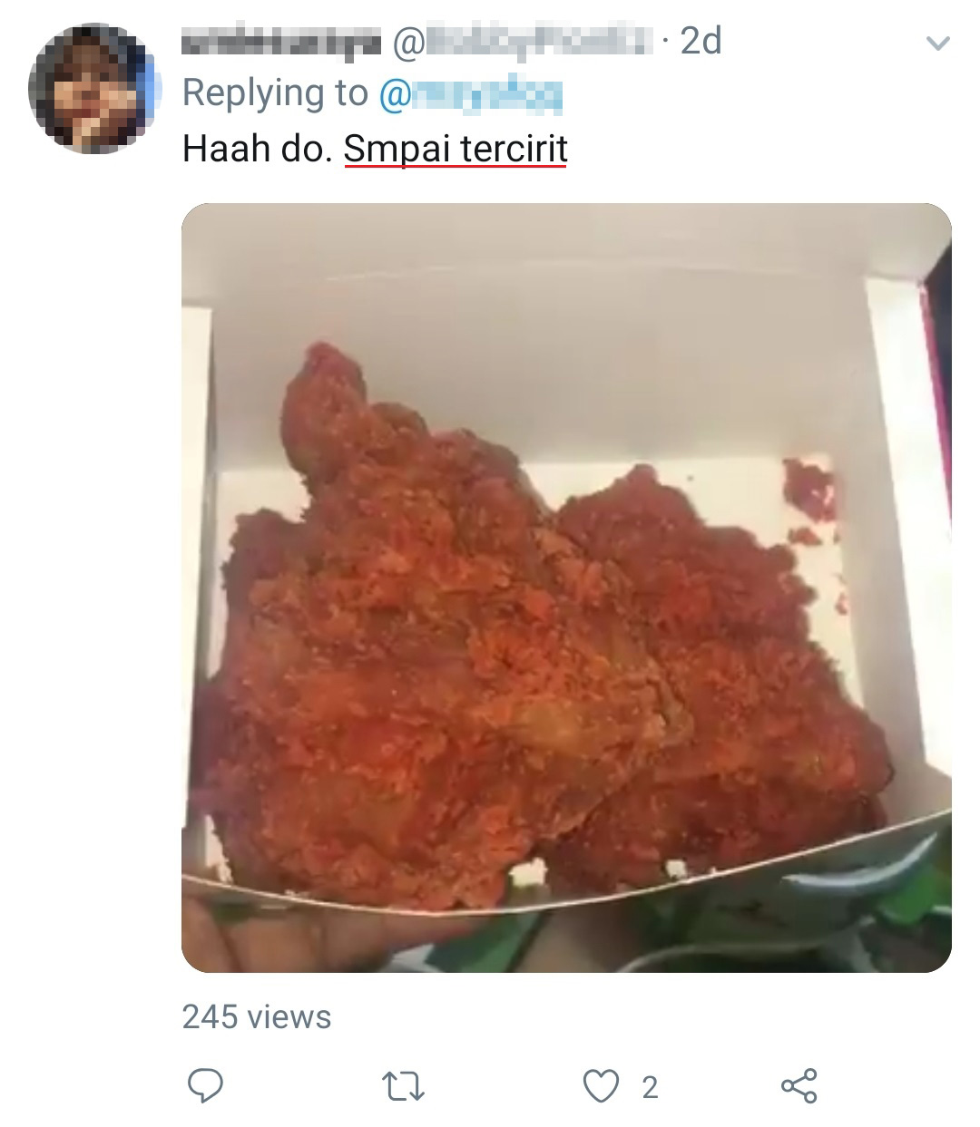 而近日又有一名网友在 Twitter 分享他尝试3倍辣炸鸡的心得,没想到3倍炸鸡竟然让他辣到拉肚子,而且拉到内裤都破了个洞!