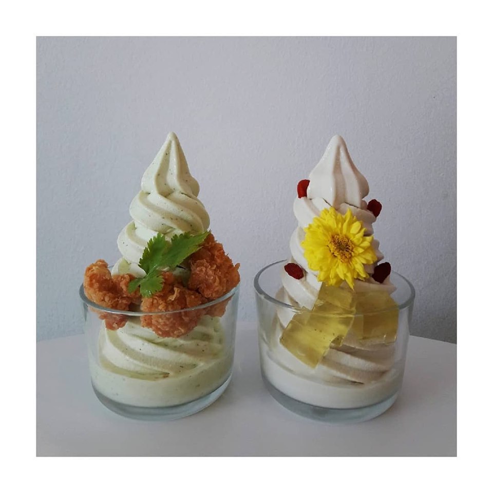 要是觉得单吃香菜冰淇淋不顶饱,你还可以尝试店里的全新组合——香菜冰淇淋+炸鸡块+松饼!