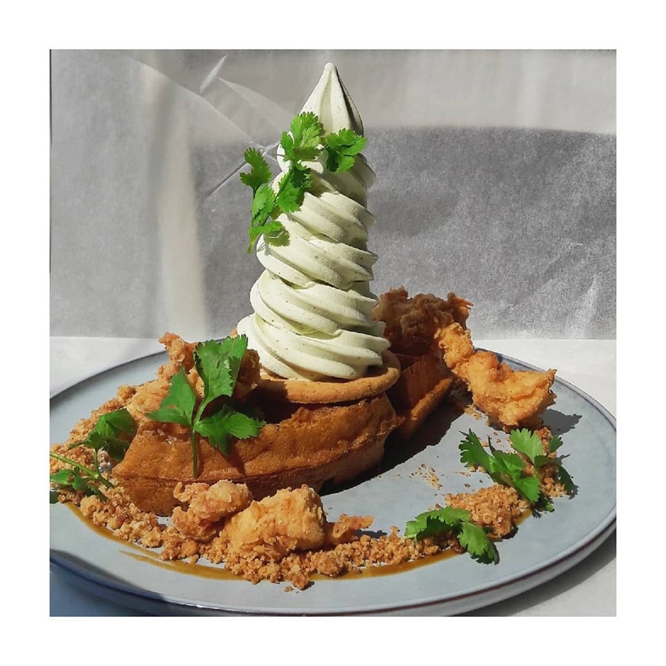 香脆可口的炸鸡块和松饼配上冰凉软腻的香菜冰淇淋,在这个炎热夏天肯定是个极致的享受!香菜迷们快举起你们的手!