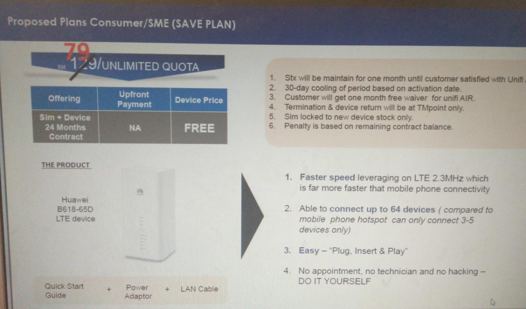 这个提议的配套月租只需RM79,并将在24个月的合同中提供免费的B618-65D LTE设备。更重要的是,该提案也提到用户将获得免费试用Unifi Air长达一个月。但终止和交还所有设备只能在TMpoints完成。
