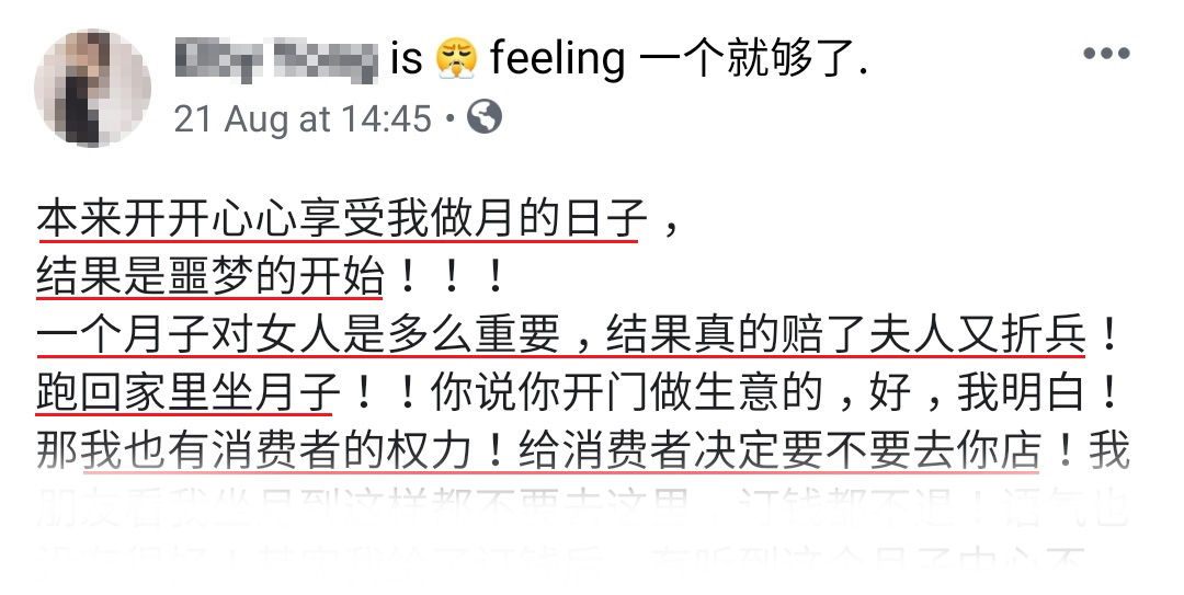 一个月子对女人是多么重要,结果真的赔了夫人又折兵!跑回家里坐月子!!你说你开门做生意的,好,我明白!那我也有消费者的权力!给消费者决定要不要去你店!我朋友看我坐月到这样都不要去这里,订钱都不退!语气也没有很好!