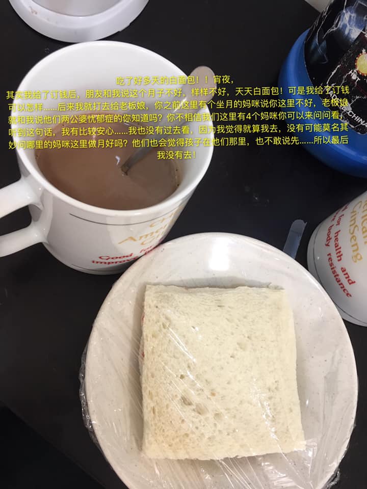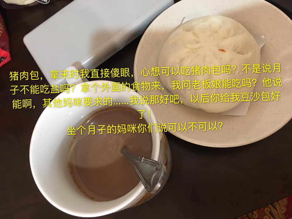 恶行 1 :提供产妇吃从外面打包的肉包,每天只给面包和可可饮料。
