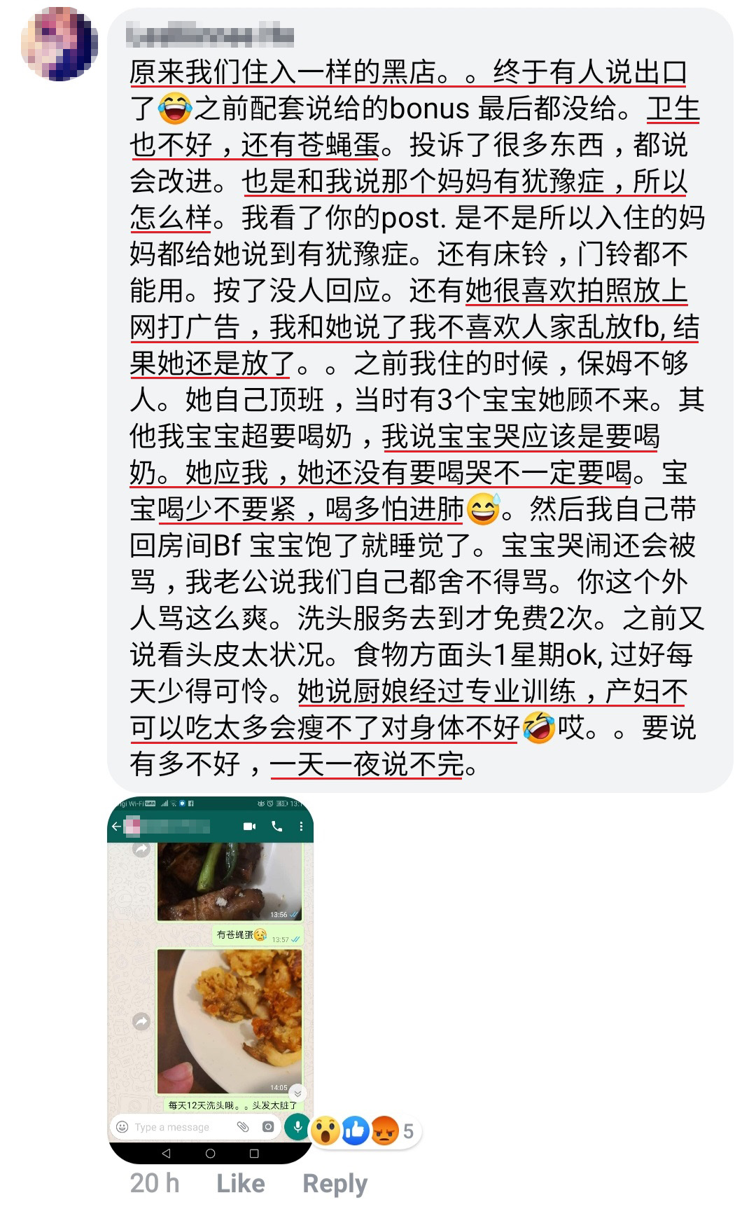 其实我给了订钱后,有听到这个月子中心不好!我有打电话给老板娘,她安抚我说:「那个妈咪有忧郁症的。和他的老公都有!」还和我说:「我这里有4个妈咪,你可以来问问看。」还和我说:「那个妈咪出月那天还赖着不走,四点多才回家!怎么会不好呢?」哇,那么敢说!我也相信了!