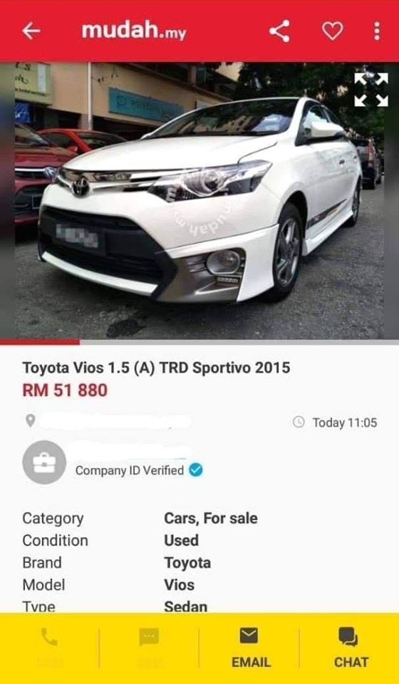 而出现在 Mudah 购物平台的照片是发生在今天的事。因为 Mudah 的该广告,一名想要购买该车子的警察联系了我的妻子。
