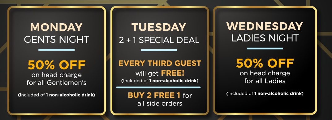 星期一 :【Gents Night】可享有50%折扣优惠还包括一杯含无酒精的饮料(此优惠以每位男士人头来计算后折扣)