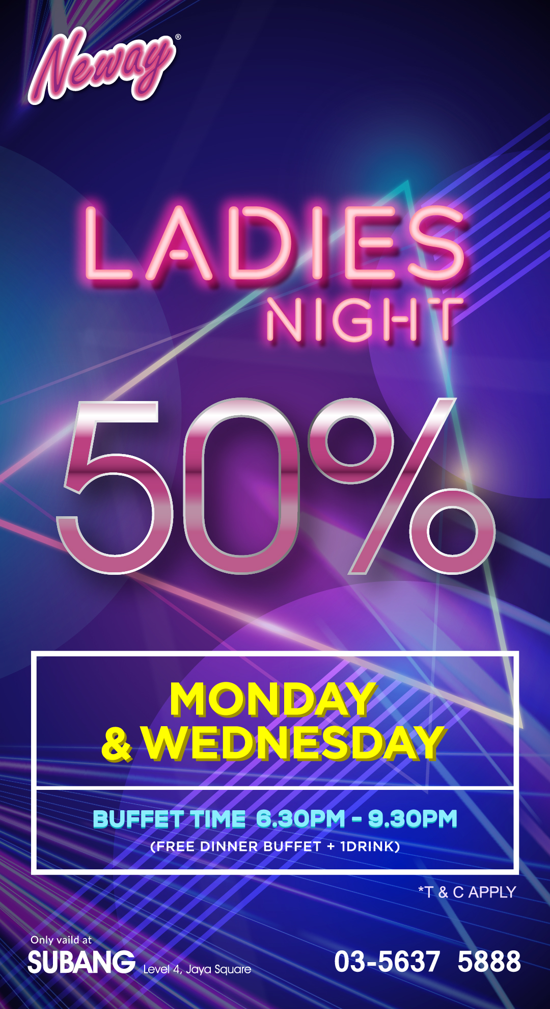 c) 以下是推出Ladies Night 50%折扣优惠!还包括自助餐和1杯饮料哦!