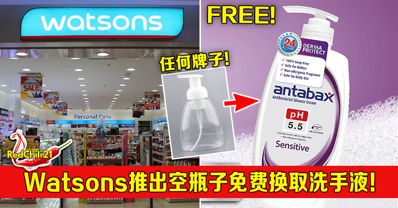 活动:Watsons 推出洗手液空瓶子免费换取Antabax 220ml的洗手液的优惠!
