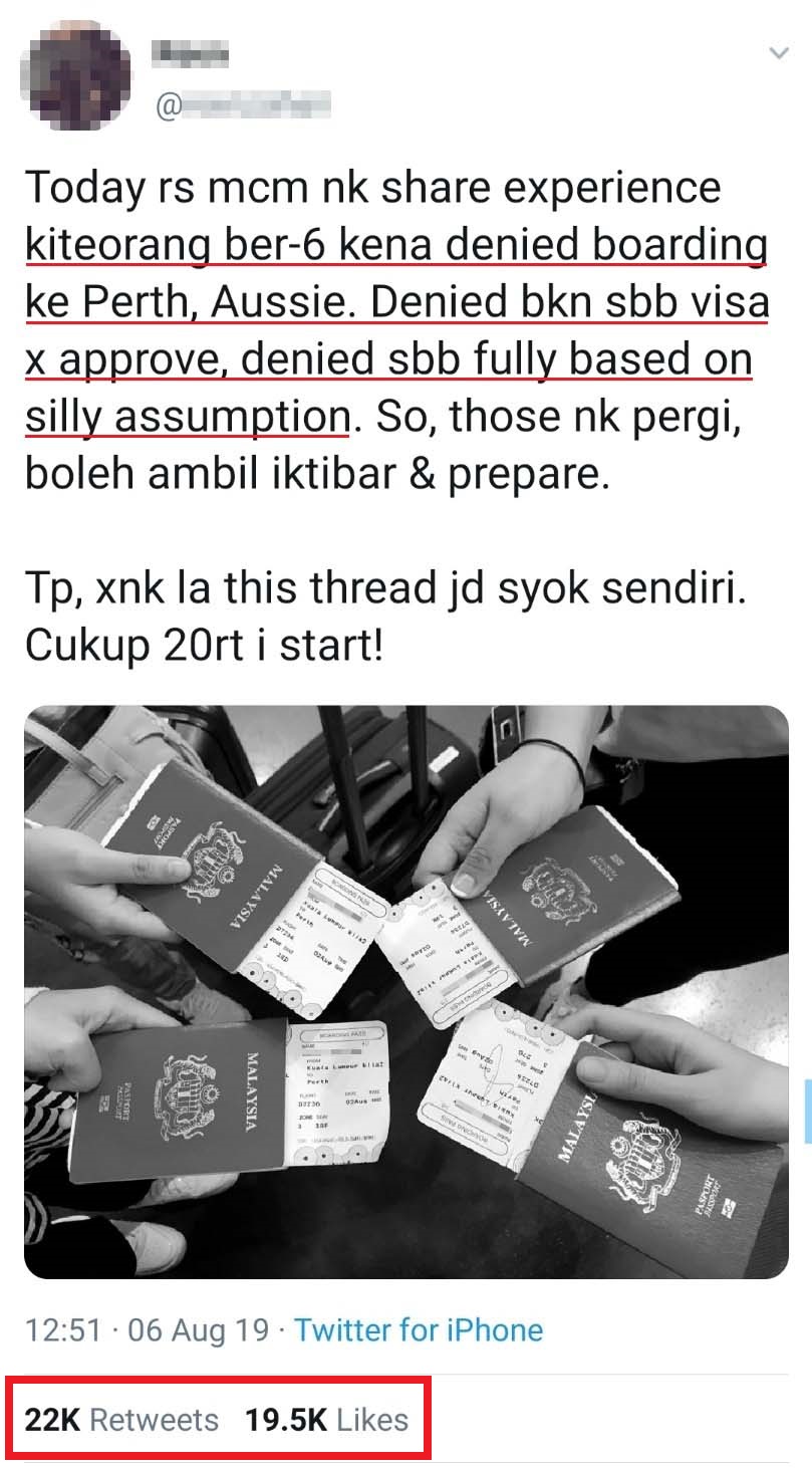 一名大马网友在 Twitter 分享了个人经历,原本既期待又兴奋的澳洲之旅,没想到在吉隆坡机场就被禁止登机,导致整段旅程泡汤!