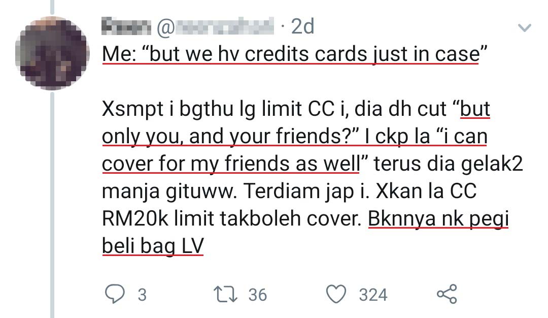 「我说我有另外带了信用卡,她又问:“那你的朋友们呢?” 我回答:“我可以用我的信用卡帮她们付款。” 我当时心想:我的信用卡限额是 RM20,000,不可能不够用。」