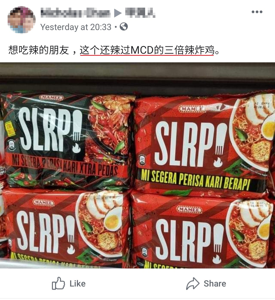 然而,近日有一名大马网友就在面子书分享了另一个极限辣度的食物,那就是 MAMEE SLRP! 快熟面!据说比麦当劳三倍辣炸鸡还辣哦!